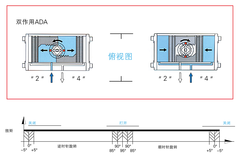 上面的示意图表明,双动作执行机构的扭矩值在整个行程中始终保持恒定。用户可根据其具体要求,参考以下内容选定合适的执行机构型号:
