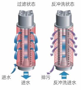 当到达一定压差时或时间,系统自动进入反洗状态,控制器控制阀门改变水流方向,反冲水压使弹簧收紧,使叠片被松开,位于滤芯支柱上的喷嘴沿切线喷射,使叠片旋转,将截留在叠片上的杂质冲洗甩出。